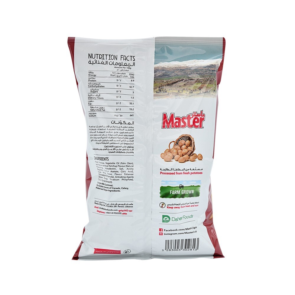 Crispy and crunchy potato chips doused in ketchup flavor are commonly served as a snack, side dish, or appetizer. A product made in Lebanon.
